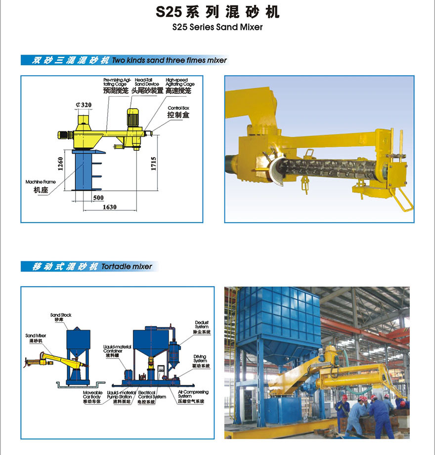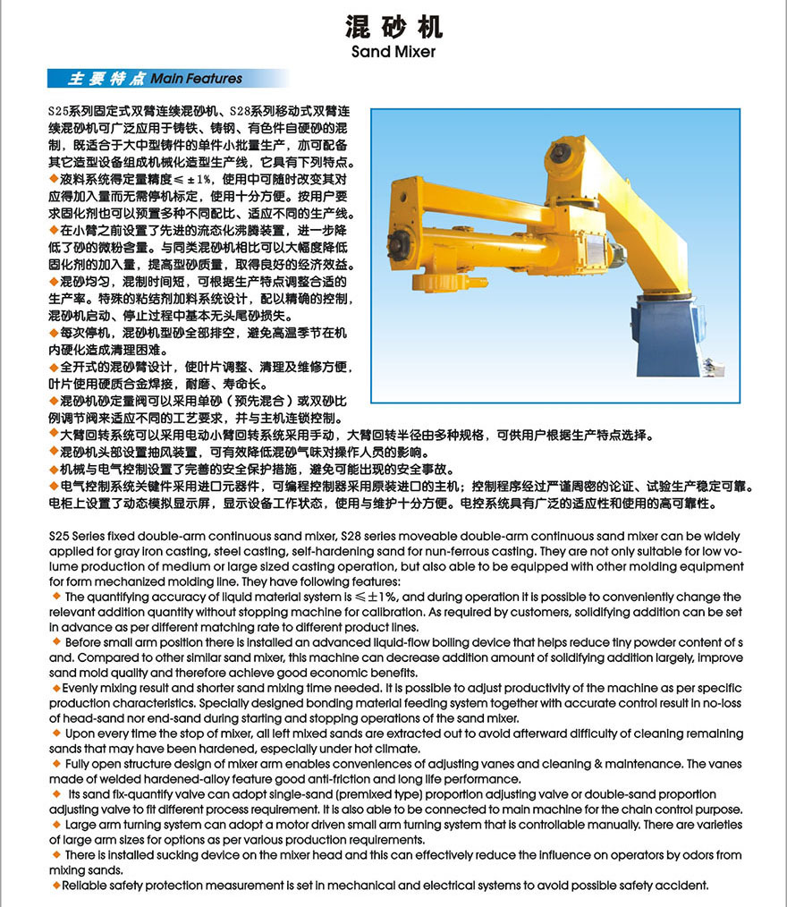 ZXS25 Stationary Continuous Sand Mixer & ZXS28 Mobile Continuous Sand Mixer can be widely used in iron foundry, steel foundry, and the mixture of nonferrous self-hardening sand. It can be produced by piece in small quantity, and it also can be equipped with other equipments to form mechanical style line, its advantages are as follows: