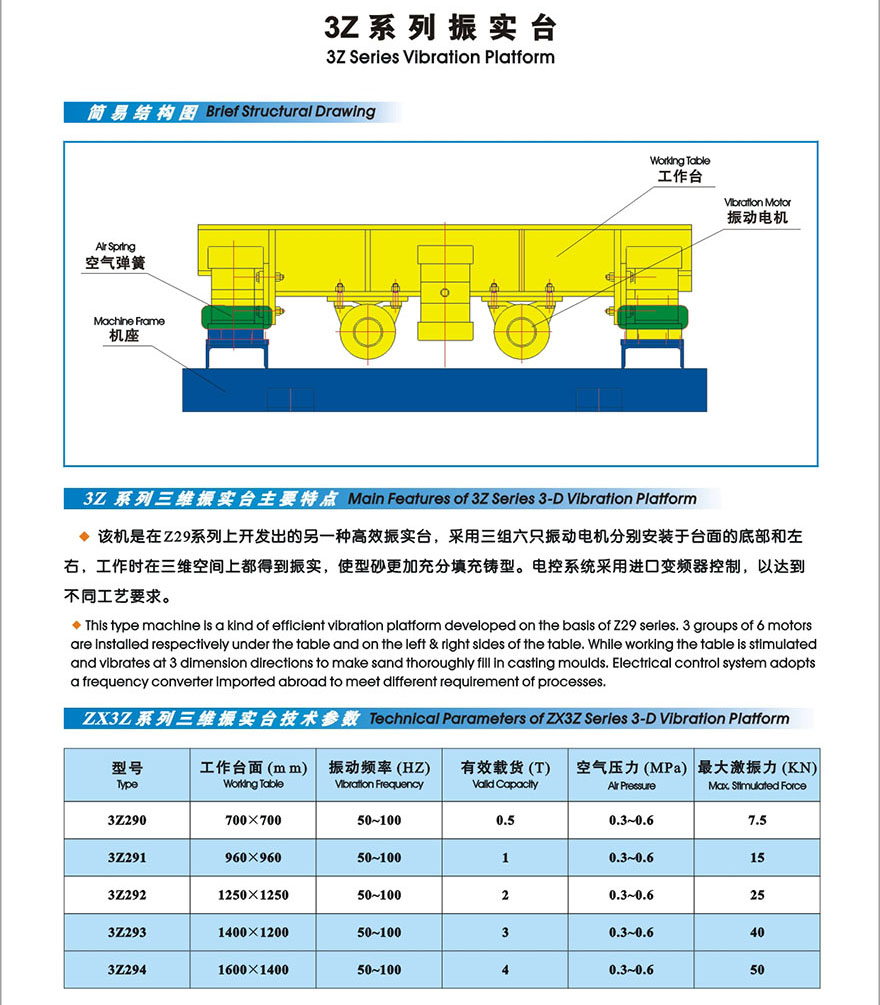 其是在ZXZ29系列上开发出的另一种高效振实台,采用三组六只振动电机分别安装于台面的底部和左右,工作时在三维空间上都得到振实,使型砂更充分填充铸型。电控系统采用进口变频器控制,以达到不同工艺要求。