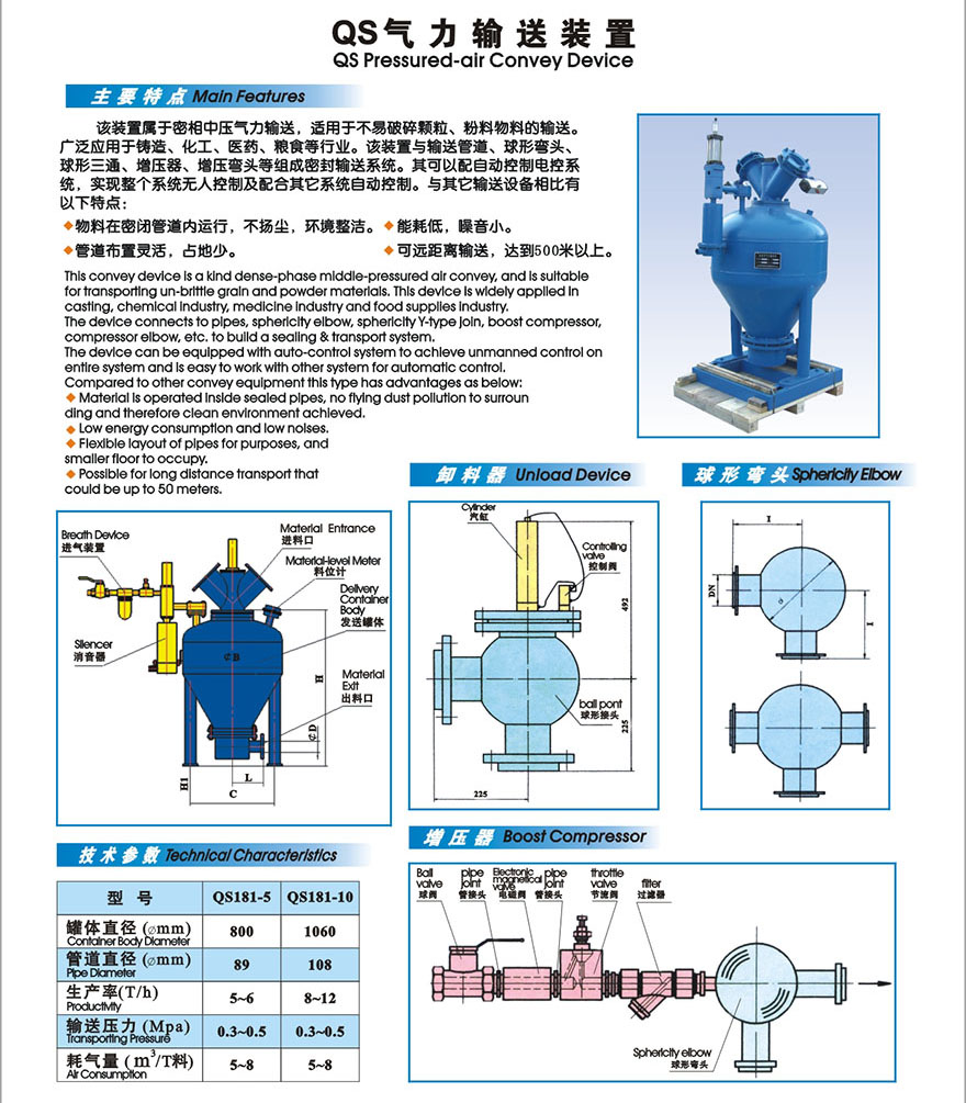 This equipment belongs to dense-phase pneumatic conveying, and it is practical to the conveying of some grain that is hard to break. It is widely used in foundry, chemical, medicine, and grain industries. The equipment as well as pipe laying, glob elbow, glob conductor, pressure-increased machine、pressure-increased elbow, etc, forms an airtight convey system. It can be collocated with electronic auto control system to realize auto control, (no supervision).